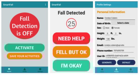We will briefly highlight some of the key features of SmartFall app. The home screen (left most screen in Figure 2) launches the SmartFall app when the user pressed the “ACTIVATE” button. A user can terminate the application by pressing the “SAVE YOUR ACTIVITIES” button. This will archive all the sensed data to the designated server and close the application. When a fall is detected, the screen in the middle of Figure 2 will be displayed with a programmable sound. The user is shown a screen with three buttons. The “NEED HELP” button will send a text message to the carer. The “FELL BUT OK” button will save the sensed data during that prediction interval as true positives. The “I’M OKAY” button will save these data as false positives. If the user did not interact with any of these three buttons, after a specified duration (e.g., 25 s), an alert message will be sent to the carer. The UI screen on the right most is for the one-time initialization of the user profile before the application can be launched. This UI includes setting up the contact details of the carer. Note that minimal personal data is collected and all those data are stored locally in the phone’s internal SQLite database. The automatically generated user-id is used by the system to differentiate different user’s data on the server. During data archiving, only this user-id and the selected sensed data such as the accelerometer data are sent to the server.