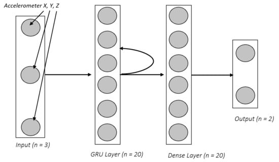 The use of deep convolutional neural networks (CNNs) showed a notable increase in the performance of detecting objects using highly challenging datasets []. The two most common implementations of deep neural networks are CNNs [] and RNNs []. CNN is a type of feed-forward artificial neural network which takes fixed size inputs and generates fixed-size outputs. CNNs are ideal for images and video processing. RNNs, unlike feed-forward neural networks, can use their internal memory to process arbitrary sequences of inputs. RNNs use time-series information, which means that past data points can influence the decision regarding current data points. RNNs are ideal for the analysis of temporal data, such as speech and sensor data streams. In summary, due the sequential nature of the data points collected from accelerometers, RNNs are better suited to our fall detection task.