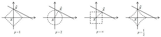 There are notably different properties of LP norms for different values of P. To illustrate this, in Figure 1 the unit sphere, i.e., , is induced by each of these norms in . We use a LP norm to measure the approximation error and our task is to find that minimizes [18]. As shown in Figure 1, to find the closest point in A to x by LP norm, we grow the LP sphere centered on x until it intersects with A. There will be the point that is closest to x for the corresponding LP norms. Through observation, we can know that a larger P tends to spread out the error more evenly among the two coefficients of two coordinate axes, while a smaller P leads to an error that is more unevenly distributed and tends to be sparser [18].