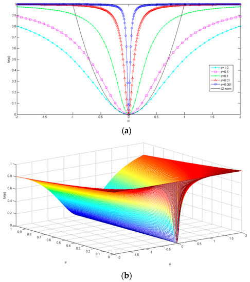 where is the ith element in the sparse signal s, and is the modulation parameter approximating the L0 norm, is the function value of the element in the sparse signal. The relation diagram of function and and is shown in Figure 2.