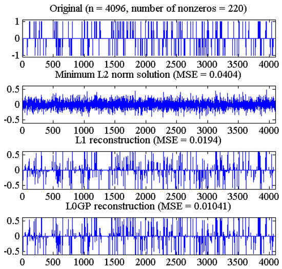Notice that for , the unique minimum of Equation (3) is the zero vector [11,27], and parameters are set as . The values of these parameters are the relatively optimal results of a large number of experiments after we tried different parameters values. In the process of experiments adjusting parameters, we think the performance of our method is not particularly sensitive to these choices, as long as these parameters are in the certain interval. The minimum L0 norm solution is given by , that is, is the pseudo inverse solution of the undetermined system . The reconstruction results of one dimensional signal are shown in Figure 3.