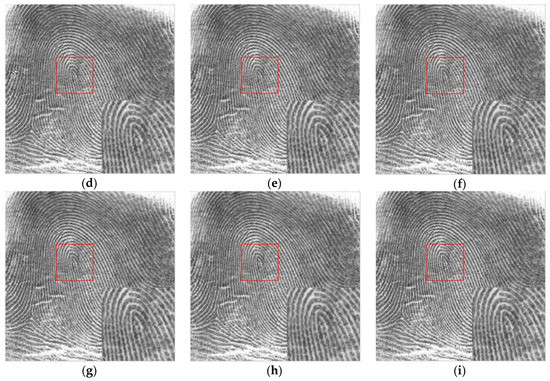 Reconstruction results of different algorithms of (a) SP, (b) IRLS, (c) OMP, (d) ROMP, (e) GOMP, (f) L1_BP, (g) L1_LS, (h) L0GP, (i) Original Fingerprint image.