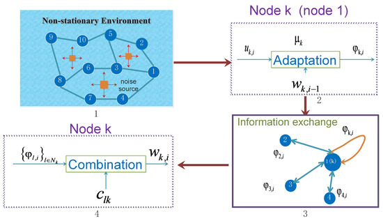 The optimization problem in Equation (3) can be solved by the diffusion strategies proposed in [30,31]. In these strategies, the estimate for each node is generated through a fixed combination strategy, which refers to giving different weights to the estimation of k’s neighbors to minimize the local function as follows: