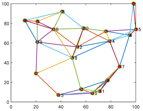 In this section, to verify the performance of the proposed diffusion logarithm-correntropy algorithm, we considered a network consisting of 20 nodes and 50 communication links. The topology is shown in Figure 3. The sensor nodes were randomly deployed in an area of and the communication distance between nodes was set as 35. All results below were averaged over 150 independent Monte Carlo simulations with randomly generated samples.