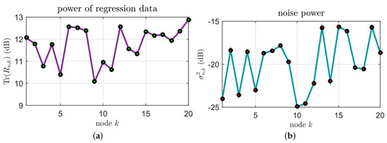 In Equation (21), is a zero-mean variable sequence with covariance matrix . Our purpose is to achieve mean square deviation (MSD) and excess mean square error (EMSE) for each node, which are defined as: