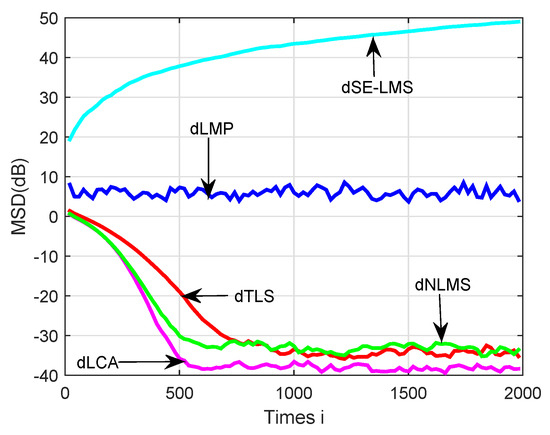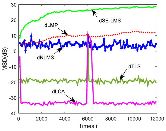 The MSD learning curves are plotted in Figure 6. It shows that the proposed dLCA algorithm obtained the fastest convergence rate when compared with the dSE-LMS, dLMP, dTLS, and dNLMS algorithms. It also shows that the dLCA algorithm could achieve relatively good performance in terms of the network MSD. The proposed algorithm had relatively smaller MSD than the mentioned algorithms. From these simulation results, it can be seen that diffusion logarithm-correntropy algorithm exhibited better tracking ability in non-stationary environments than the existing classical algorithms.