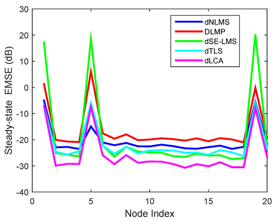 Figure 7 compares the steady-state EMSE performances of related algorithms on each node in the sensor networks. It can be observed that a large difference was observed at some nodes that achieved low EMSE. By averaging over 150 experiments and over 50 time samples after convergence, the steady-state EMSE values were obtained. The proposed algorithm captured a better trend of the steady-state performance than other algorithms.