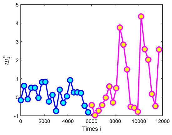 In this simulation part, firstly, the performance of the proposed algorithm was verified in a non-stationary environment over sensor networks and the communication links were ideal. In Figure 4, the regression inputs are independent identically distributed (i.i.d.), which are zero-mean Gaussian vectors with covariance matrices , and the is the input variance. The background noises are drawn independently of the regressors and are i.i.d. The unknown parameter vector is time-varying, as Figure 5 shows. The fixed step-size = is used in the simulations.