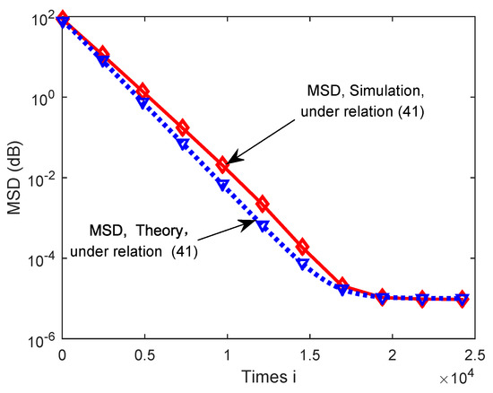Finally, we compared the simulated network MSD curves with theoretical results under Equation (41) in Figure 10. One can see that theoretical network MSD curves of the proposed algorithm showed good match with its simulated MSD curves.