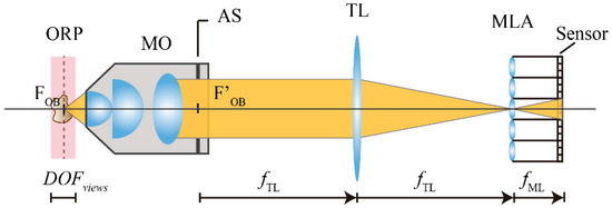 . With this configuration, the camera sensor records a set of micro images, as many as the number of microlenses in the array, which contains the spatial and angular information of a 3D microscopic sample. To make proper use of the pixels of the camera and thus to avoid any overlapping between the microimages, it is important to match the numerical aperture of the MO, expressed at the image side