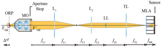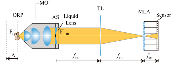 It is important to note that the LL is not inserted directly at the aperture stop of the MO but in a conjugated plane, so Equation (6) has to be modified to take into account the effective optical power induced at the liquid lens (