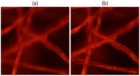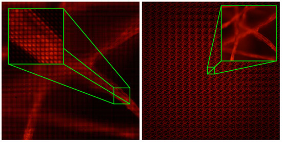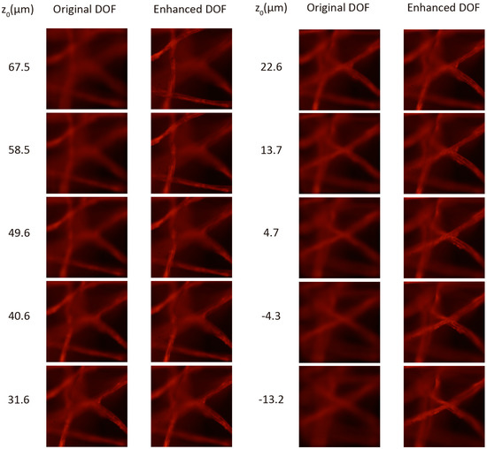 Figure 5b it is easy to note that many regions of the 3D sample are out of focus. As a matter of fact, the DOF is not very extended. We can calculate it using Equation (2) whilst taking into account the parameters of the system, which we can see is around 17 μm (for an emission wavelength of 630 nm).