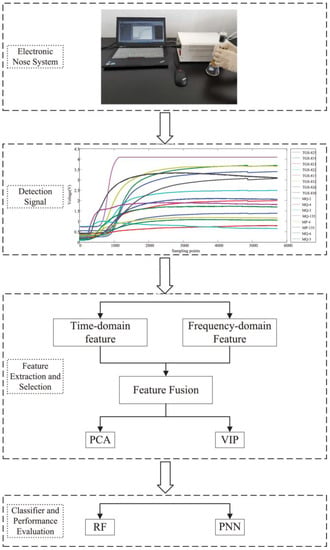 In conclusion, taking eight different brands of Chinese liquors as an example, our work adopted the odor fingerprint analysis based on olfactory sensory evaluation and the feature mining method which combined the time domain and frequency domain to simulate human olfaction and to identify various odors. Variable selection using VIP scores is especially suitable for extracting features from a mass of data. In addition, the VIP-based models achieved better prediction accuracies than the PCA’s. The results demonstrated that VIP coupled with the RF or PNN network is effective in extracting and analyzing features of odor fingerprint. Compared with the PNN model, the RF model achieved the slightly higher accuracy. Meanwhile, compared with the traditional statistical methods and simple extraction, this feature mining method used the least characteristic variables and the best fusion method and can capture hidden patterns and variables inside the odor fingerprint. The odor fingerprint analysis using the feature mining method based on olfactory sensory evaluation can be applied to the food and drinks industry for product discrimination, classification, quality and control. Besides, the lab-developed intelligent nose can be used in the actual process of industrialization to monitor product quality.
