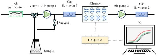 As shown in Figure 2, the lab-developed intelligent nose system contains three units—the air flow velocity and direction control unit (consists of air purification, valve, gas flowmeter, and air pump), the sensors unit (includes sensor arrays and chamber), and the data acquisition and analysis unit (contains data acquisition card (DAQ) and PC with the self-made test software). The two major functions (gas injection and system cleaning) were carried out by adjusting valves. The air purification consists of activated carbon, molecular sieve and allochroic silicagel gel, and more remarkably, allochroic silicagel gel, which belongs to the high-grade drying agent, can visually signal the relative humidity of the environment according to the color variation (from blue to red). It is usually used for instruments, equipments and other closed conditions. The role of air pump 1 and 2 are to clean the system and to collect gas, respectively. In addition, the combination of these two air pumps are used to raise the gas volume rate in the gas cleaning process. The dimension of the chamber is 10.5 cm long, 8.2 cm wide and 5 cm high with a volume of about 431 cm3. The chamber is made of cardboard which is covered by Polytetrafluoroethylene (PTFE). PTFE has weak adsorption and strong leakproofness so that there is no other interfering research to affect the test results in the air chamber. Sensor arrays contain a temperature sensor, humidity sensor and 16 independent sensors. LM35CZ type temperature sensor by National Semiconductor, Santa Clara, CA, USA and HIH-4000-003 type humidity sensor by Yi Jiajie Electronic Technology CO., LTD, ShenZhen, China, in the air chamber are used to monitor the internal temperature and humidity. Sixteen independent sensors are sensitive to different substances. These sensors can detect odor fingerprint data and consist of two systems: TGS-8 system by FIGARO, Japan and MQ/MP system by ZhengZhou Winsen Electronics Techbology CO., LTD, ZhengZhou, China. Details of these sensors used in the experiment are listed in Table 2. The NI USB-6211 type data acquisition card by National Instruments, Austin, TX, USA, was selected to collect data. There are eight analog input channels and two analog output channels and the sample rate reaches 48 Ks/s.