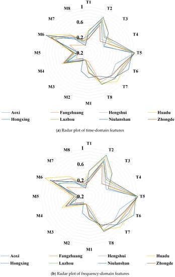 Figure 6a,b shows radar plots for time domain and frequency domain features, respectively. Since each sensor detects cross-information of olfactory, it is difficult to determine which features are the characteristic values that affect the olfactory information of liquors. It can be seen that the sensor T3 and T4 are obviously different in AV value. Does it proves these two values are the main factors affecting the olfactory information of Chinese liquors? Meanwhile, the sensor M1 and M2 are slightly difference in MV value. Does it proves these two characteristics have little effect on the olfactory information of Chinese liquors? Therefore, it is indispensable to find a suitable feature mining method to delete the redundant information and select characteristic features that can affect the olfactory information of Chinese liquors. In addition, the best combination of variables and fusion methods to reduce the complexity of the model prediction and achieve the best classification performance have to be chosen.