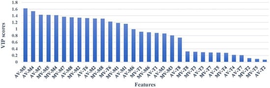 In the Partial Least Square (PLS), the Variable Importance of Projection (VIP) scores were used to create a new data space in a lower dimensional system []. The VIP scores can express the interpretative ability of the independent variables to dependent variables. With higher scores meaning a greater rate of contribution to covariance and stronger distinguishing ability, each variable of the original feature was evaluated and obtained corresponding scores. These variables were sorted based on the VIP scores and selected to form the new characteristic space. The feature fusion strategy is as follows: (1) The original features that fused time domain and frequency domain were sorted based on VIP scores. (2) K = [k1, k2, …, km] variable subsets were generated based on the best VIP scores. Which ki means the subset has top ith variables and m is the number of all variables. In this paper, we analyzed the original features and generated 32 subsets based on the VIP scores to express the interaction between different variables.