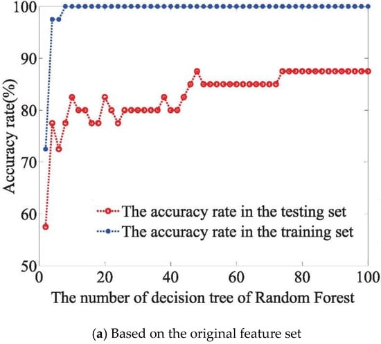 In RF networks, the value of mtry and the number of decision trees are the main parameters of generalization performance. The default mtry value is the square root of the total number of variables, so the value of mtry in the experiment was four. We selected the number of decision trees from 2 to 100 at two trees intervals. The training accuracy rate and predicting accuracy rate were regarded as the evaluation criterion. From this, we can focus on the influence of decision trees on the classification performance in RF networks.