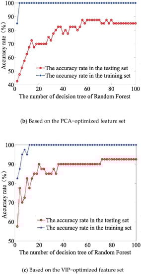 The three feature sets (original, PCA-optimized, and VIP-optimized, from which the 15th variable subset was extracted based on the VIP scores) combined with the RF model achieved the classification for olfactory information of Chinese liquors. To reduce the impact of randomness, 100 prediction models were established, and their accuracy rates were averaged as the classification accuracy rate of the current model. As shown form Figure 9a–c, the training accuracy rate reaches 100% when the number of decision trees is greater than 8, 4, and 12, respectively. Besides, in the RF model based on the VIP-optimized feature set, when the number of decision trees exceeds 72, the testing accuracy reaches up to 92.5%. Further, along with the continual increase of the decision trees, the system remains stable. Results showed that the olfactory information of original features contains redundant information. Besides, the feature mining method based on VIP-optimized can extract effective features.