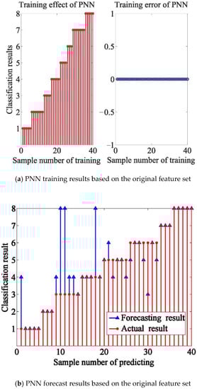 Probabilistic Neural Networks (PNN) is the supervised classifier which was first put forward by D. F. Speeht in 1990 []. It is a parallel algorithm based on the Bayes classification rule and the Parzen window’s probability density function. With its simple learning process, fast training speed, better compatibility and strong nonlinear ability, PNN was applied to image recognition [], chemical detection [] and stereo vision matching [] fields. PNN generally consists of four layers: The input layer, the model layer, the summation layer, and the output layer. The steps of PNN networks are as follows: (1) Collecting sample data and dividing into a training set and a testing set. (2) Creating PNN networks and training the network according to training sets. (3) Testing network performance.