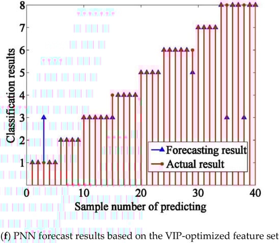 (3) Compared with the original feature and PCA-optimized, selected features based on the best VIP scores obtained the obvious promotion of the classification performance. The classification accuracy of the RF network in subset #15 and the PNN network in subset #16 was 92.5% and 87.5%, respectively. Finally, the RF network showed the best classification performance of 92.5% in subset #15. Combined with VIP scores, AVM5, AVM4, AVM7, MVM5, MVM4, MVM7, AVM8, MVM2, AVT6, AVM2, MVM8, MVT6, MVM1, AVM1, and AVM6 were considered as the characteristic features.