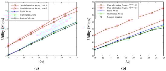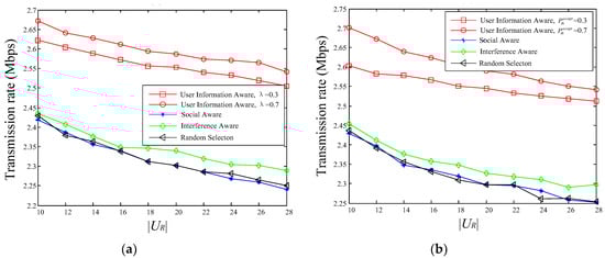 Figure 7, and we can easily find that the transmission rate of the proposed scheme is greater than the other three schemes. With the number of service requesters increases, the performance of the user-information-aware scheme is still better than other three schemes, although the transmission rate of all four schemes has declined to varying degrees. The interference-aware scheme is better than social-aware scheme and the Random cluster-head selection scheme. What’s more, the decline of user-information-aware scheme slower than other three schemes, followed by the interference-aware scheme. Compared with the social-aware scheme and the random cluster-head selection scheme, the channel quality information between users is considered in the interference-aware scheme, which makes the transmission rate of the interference-aware scheme is better than the above two schemes. Although the purpose of the proposed scheme is to maximize the utility value, the transmission rate is also better than the other schemes. It can be seen from Equation (22) that this scheme considers the channel quality information and social relationship information at the same time, and owns more members in the D2D multicast cluster to facilitate the selection of suitable cluster head.