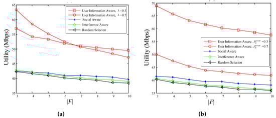 Figure 6 shows that the utility value of all four schemes decreases dramatically as the number of video files increases. Due to the decrease of both the intensity of social relations and the number of potential servicing users, the decrease speed of the proposed scheme is faster than the other three schemes, but the utility value of the proposed scheme is still greater than the other three schemes. For the same reason mentioned above, the performance of the proposed scheme differs under different parameter settings.