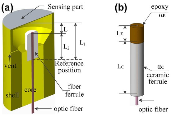 To understand the effect of temperature on the static cavity length, the relationship between the static cavity length and temperature must be derived. The main components of the probe include the shell, core, sensing part, fiber ferrule, and optic fiber, as shown in Figure 1a. The thermal expansion coefficient of the fiber is about 0.55 × 10−6 m/(m·°C). This is far less than that of the ferrule and the shell. The thermal effect of the fiber can be neglected. The materials of the shell and core were selected to be the same, and their thermal expansion coefficients are referred as α1. The thermal expansion coefficient of the fiber ferrule is referred as α2 and the bottom of the fiber ferrule is referred to as a reference position for all length.