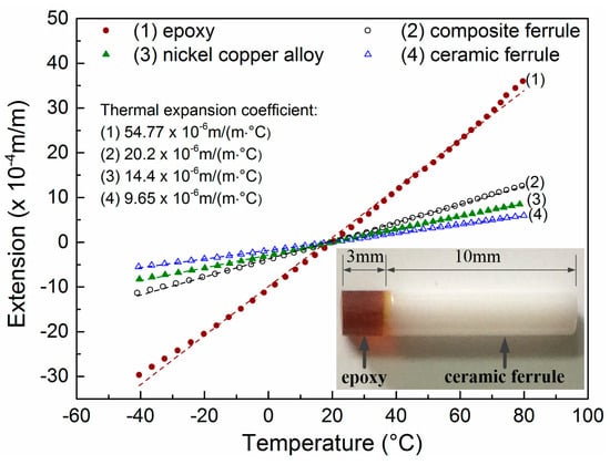 The expansion coefficients of epoxy, nickel–copper alloy, ceramic ferrule, and composite ferrule were experimentally tested, as shown in Figure 2. αC was about 9.65 × 10−6 m/(m·°C), and αE was about 55 × 10−6 m/(m·°C). The dotted lines for each curve are linearly fit curves. The inset in Figure 2 is a composite ferrule sample of epoxy and ceramic ferrule. For the sample, LC = 10 mm, LE = 3 mm, and the calculated value of thermal expansion coefficient was about 20.06 × 10−6 m/(m·°C). While the experimental value was about 20.2 × 10−6 m/(m·°C), they agreed with each other well. This result indicates that the thermal expansion coefficient could be designed according to Equation (12).