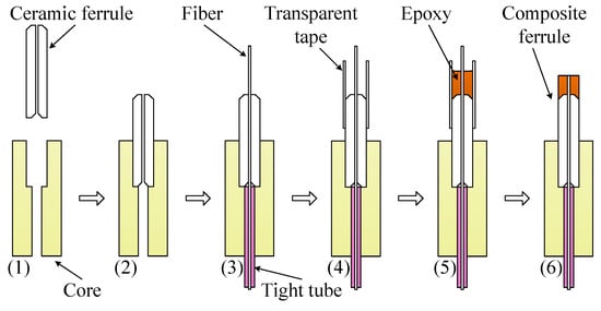 Figure 3 shows the process of fabricating a composite ferrule. First, a ceramic ferrule was pressed into a core, and then optical fiber was inserted into the ceramic ferrule (steps (1)–(3)). It should be noted that the part of the optical fiber above the end surface of the ceramic ferrule was more than 5 mm. Next, by using transparent tape, a fence was formed around it (step (4)), and then epoxy was injected into it (step (5)). In order to accelerate the curing of epoxy, it was put into a drying box at temperatures of 60–90 °C. After curing the epoxy, the transparent tape was removed, and the excess fiber was cut off. Then, the fiber with composite ferrule was grounded and polished (step (6)). It should be emphasized that the thermal expansion coefficient of the composite ferrule must be more than that of the shell. For ceramic ferrule with a length of 10 mm, the length of the epoxy part should not be less than 1.5 mm, at least.