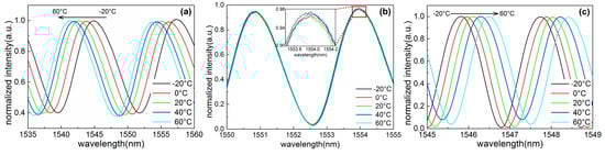 Figure 4 shows the normalized interference spectroscopies of a typical FFPC acoustic sensor probe with different static cavity lengths in a temperature range of −20 to 60 °C every 20 °C. At each testing temperature, the temperature was kept constant for more than 15 min. Then, the spectroscopy was acquired by a spectrometer.