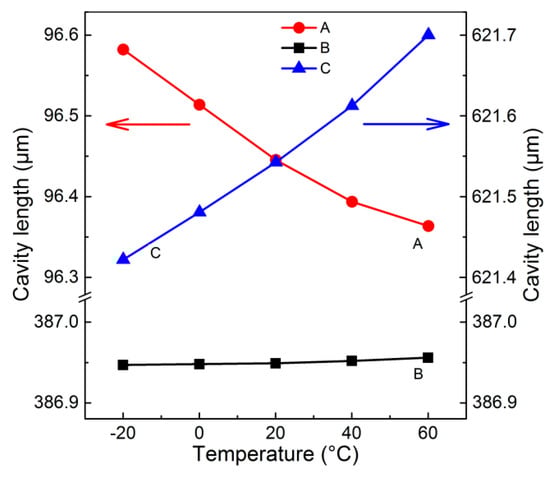 According to interference spectroscopy shown in Figure 4, we can obtain the cavity length of the FFPC probe at every testing temperature point. Figure 5 shows the cavity length-temperature curves of the FFPC probe at different static cavity lengths. Curves A, B, and C correspond to Figure 4a–c, respectively. The scale of the cavity length axis in Figure 5 is proportional. The slope of the curves represents ΔL/ΔT. From Figure 5, we can intuitively observe that the value of ΔL/ΔT varies from a negative value to about zero until reaching a positive value with the static cavity length increasing.