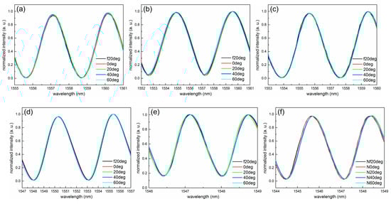 By applying structure compensation, another six FFPC acoustic sensor probes were fabricated. Every probe was adjusted to its proper cavity length, which was 386.91 μm (Figure 6a), 258.89 μm (Figure 6b), 319.69 μm (Figure 6c), 239.54 μm (Figure 6d), 744.19 μm (Figure 6e), and 448.72 μm (Figure 6f). The interference spectroscopies of these probes with increasing temperature are shown in Figure 6. The curves in Figure 6 almost overlap each other. These results indicate that the structure compensation has good reproducibility.