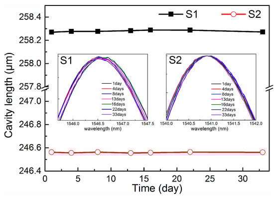 We also investigated the time-dependent stability of the FFPC acoustic sensor probe. Figure 7 shows the cavity length-time curve of two typical samples. The insets in Figure 7 are the interference spectroscopies of the two samples (S1 and S2). According to the interference spectroscopies, for sample S1, L = 258.252 μm, λ0 = 1546.541 nm, and maximum Δλ is 58 pm; so, the change of cavity length ΔL is about 9.7 nm. For sample S2, L = 245.772 μm, λ0 = 1540.913 nm, and maximum Δλ is 43 pm; so, the change of cavity length ΔL is about 6.9 nm. Thus, the cavity length has a change of about ±10 nm during about a month, which has limited impacts on the reliability of the sensors.