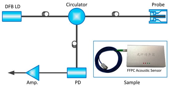 So far, it is worth emphasizing that the structure compensation provides a simple approach that allows the probe to be used in practical applications. If employing this probe to fabricate an acoustic sensor, the expensive tunable laser and complicated feedback system are no long required. To exhibit this advantage, an FFPC acoustic sensor was fabricated by only using a butterfly packaged DFB laser diode (LD), a circulator photo diode (PD), and an amplifier (Amp.). The schematic structure of the FFPC acoustic sensor is shown in Figure 8. The photo shown in the lower right corner in Figure 8 is the sample. It is obvious that the system is concise and tight. The principle of the acoustic sensor has been described in other papers [24,25,26].