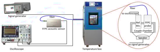 To investigate the effects of temperature on the FFPC acoustic sensor, it was transferred into a precisely controllable temperature box (model JT, made by Dongguan Jinte Instrument Co., Ltd., Dongguan, Guangdong, China). An electret condenser microphone (type 1/2 inch, made by Research Institute of Television and Electro-acoustics, Beijing, China) was employed as a reference. The output of the sensors was recorded by an oscilloscope (KEYSIGHT DSOX2024A). A sound wave was produced by a speaker driven by a signal generator (KEYSIGHT 33510B). The experimental setup is shown in Figure 9. The enlarged dot circle shows the details of the part of the testing system in the temperature box.