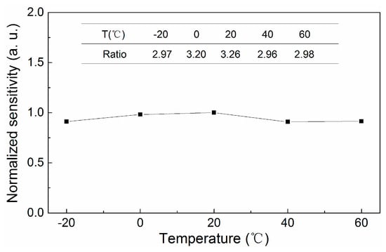 The ratio of the output of the FFPC acoustic sensor to that of the electret acoustic sensor has was calculated, as shown in the inset chart in Figure 10. The normalized sensitivity-temperature curve of the FFPC acoustic sensor was also obtained, as shown in Figure 10. The sensitivity had a relative change of 9.2% in the temperature range of −20 to 60 °C, which is acceptable in practical applications. The results show that the FFPC acoustic sensor with structure compensation has good thermal stability.