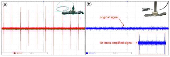 Because of the high sensitivity of the FFPC acoustic sensor, it is suitable for detecting weak sound. To exhibit this ability, we put the sensing probe on the glass of a quartz watch and observed the output of the sensor by an oscilloscope. Figure 12a shows the sound signal of the working second hand. The signal is the original output of the FFPC acoustic sensor without any amplification. It shows clear pulses with a period of 1 s.