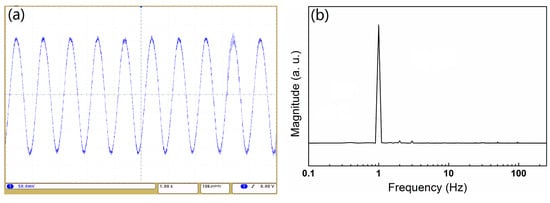 Time-domain signal of an FFPC acoustic sensor for a 1-Hz sound excitation (a) and FFT of a time-domain signal (b).
