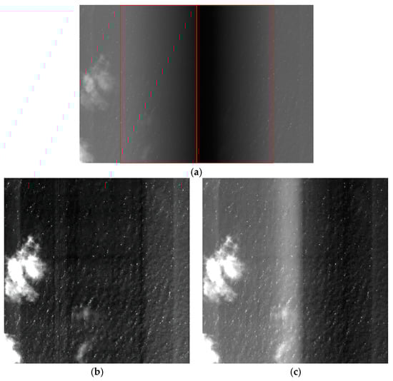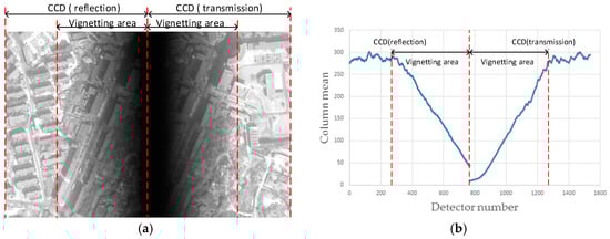 The use of high-resolution optical satellite imagery has increased over the past decade, reaching the highest level at the decimeter level and moving toward the centimeter level. The push-broom camera has attracted a great deal of attention due to its high signal-to-noise ratio (SNR). To extend the width of high-resolution optical remote-sensing satellites, charge coupled device (CCD) focal plane assemblies have been used to meet the requirement for a large field of view (FOV) [1,2,3,4]. At present, mainly mechanical butting and optical butting are used. Mechanical butting usually involves a few CCDs arranged in a straight line or a two-row staggered assembly in a focal plane. Optical butting can be divided into refractive, transflective and reflective types. Among these, refractive butting produces aberrations, and the energy utilization of transflective butting is less than 50%. Reflective butting has several advantages, including greater butting length, high energy efficiency, low weight and the lack of aberration. However, reflective butting results in vignetting in areas of overlap, the elimination of which requires image processing [5]. Figure 1 shows the impact of vignetting on image quality. The left image of Figure 1a represents the reflection CCD, and the right image represents the transmission CCD, with the vignetting area in the middle, as can be seen from Figure 1a. Due to the impact of vignetting, the features of the image in the vignetting area cannot be identified, which will be hard to use. Figure 1b shows the column mean of the image of Figure 1a. It shows that the brightness value of the image in the vignetting area is degraded, which greatly affects the interpretation of the image. Therefore, for the optical butting imaging system, it is essential to do the vignetting correction efficiently and accurately.