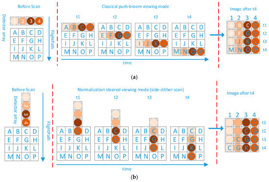 (a) Classical push-broom viewing mode; (b) normalization-steered viewing mode (side-slither scan).