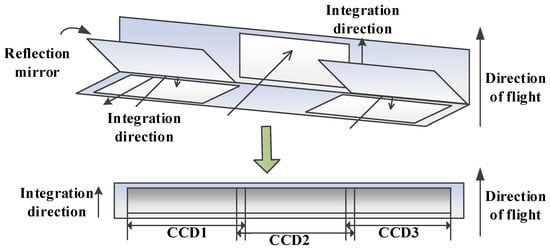 The optical butting system based on reflectors is characterized by high energy efficiency and collinear time delay integral (TDI)-CCD imaging. Figure 3 shows the focal plane of optical butting based on reflectors. The sensors consist of three CCDs installed in the transmission and reflection areas in the focal plane, forming a continuous virtual CCD array in an approximately straight line. However, this arrangement produces an area of overlap affected by vignetting [26].