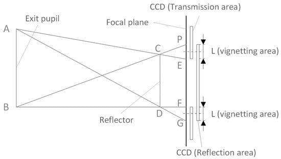 For optical butting based on a reflector, the reflector mirror is usually implemented between the exit pupil and the focal plane of the optical system. The focal plane optical butting model is shown in Figure 4. In Figure 4, AB is the exit pupil diameter of the optical system, and CD is the length of the butting mirror. The light filled with the exit pupil is cut by the reflector mirror, and the vignetting areas PE and FG are formed on the focal plane (i.e., the CCD photosensitive surface), while the length of the CCD overlap area is L [27].