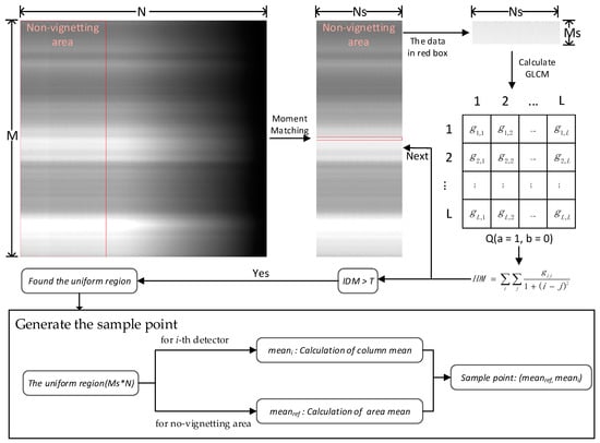 Figure 7 shows the process of the extraction of the sample points using the GLCM, which is divided into three steps: moment matching, uniformity region determination and generation of sample data. Here, the size of the standard image is assumed to be , where the size of the non-vignetting area is . First, the non-vignetting area in the standard data was determined, and moment matching was applied in this area to remove the influence of noise. Then, the area of size Ms ∗ Ns in the non-vignetting area was chosen by the order of rows to determine whether the area was uniform. The GLCM for this area was calculated, and the IDM was obtained. If the IDM met the threshold T, this area was regarded as uniform, and the start line of the area was recorded; otherwise, the next area was chosen. Finally, the column mean value for the chosen area, of size Ms ∗ N on the standard image, was calculated.