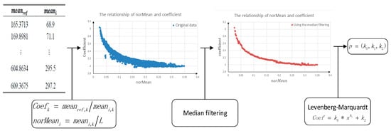 Figure 8 shows the process used to obtain the parameters of , which was divided into three steps. First, the sample point data were normalized, and the sample coefficients were calculated. Second, to maintain fitting accuracy, median filtering was used. Finally, the fitting parameters were obtained using the LM algorithm to fit the model.