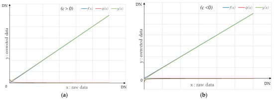 The blue line represents the linear transformation ; the red line represents the power-law function ; and the green line represents the correction model . Figure 9a presents a simulation for c > 0, and Figure 9b presents a simulation for c < 0. Figure 9 shows the influence of the power-law function on the linear part, which is concentrated mainly in the low-luminance region. It is determined by the long tail effect of the power-law function. Therefore, the correction model for the i-th detector proposed in this paper can be described as: