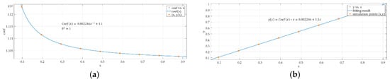 Figure 10 shows the result of fitting 10 points that are linear. Figure 10a shows the coefficients obtained using the simulation points based on the power-law model. It can be seen that , while the response is linear. Figure 10b shows the fitting result (blue line), and the orange points represent the simulation points, The power-law model can be degenerated into a linear model while the response is linear. The results show that when the response is linear, the effect of fitting using the power-law model is consistent with that of using the linear model. Therefore, it can be seen that the power-law model can be compatible with both the linear response and the nonlinear response. Next, the paper describes the process of obtaining the coefficients using the power-law models.