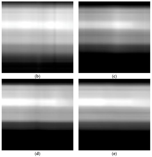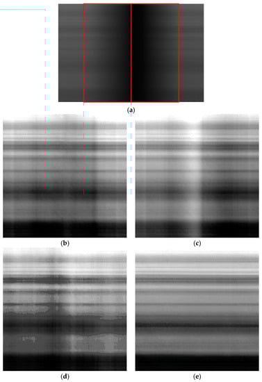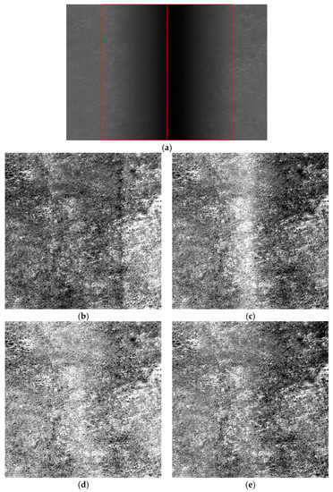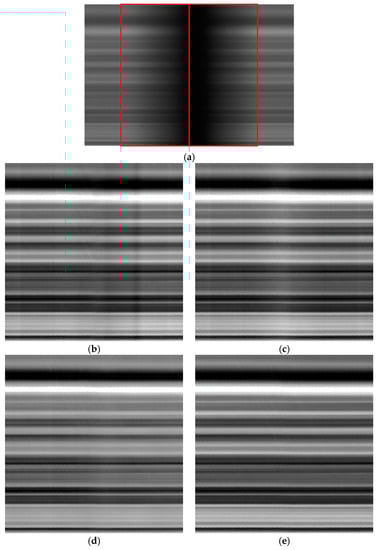 Corrected images of the middle brightness region of the side-slither data (the images were stretched for display): (a) raw data for the low-brightness region; (b) results obtained using polynomial fitting; (c) results obtained using laboratory coefficients; (d) results generated using on-orbit coefficients; (e) results generated using coefficients obtained by the proposed method.