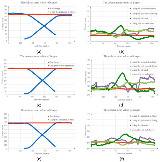 Column mean values for the raw data and corrected images: (a) low-brightness region, column mean values for the raw data and results obtained using the proposed method; (b) low-brightness region, column mean values for the corrected images; (c) middle brightness region, column mean values for the raw data and results obtained using the proposed method; (d) middle brightness region, column mean values for the corrected images; (e) high-brightness region, column mean values for the raw data and results obtained using the proposed method; (f) high-brightness region, column mean values for the corrected images.
