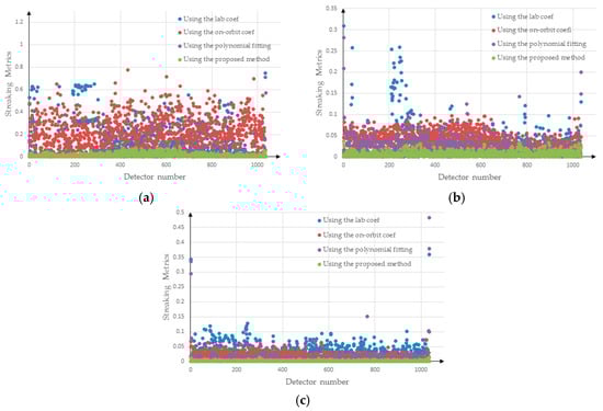 Figure 15 shows the distribution of streaking metrics for the corrected images, where the abscissa indicates the detector number and the ordinate indicates the streaking metrics. The blue dots represent the streaking metrics for the images corrected using the laboratory coefficients; the red dots represent the streaking metrics for the images corrected using the method proposed in this paper; the purple dots represent the streaking metrics for the images corrected using the polynomial fitting; and the green dots represent the streaking metrics for the images corrected using the on-orbit coefficients. Figure 15a–c represents the distribution of streaking metrics for the low-brightness, middle brightness and high-brightness areas, respectively. Figure 15a shows that after correction using the laboratory coefficients, the maximum value of the streaking metrics was close to 0.8, and a large proportion of the streaking metrics for all columns had values exceeding 0.2, whereas the maximum value of the streaking metrics for the image corrected using the proposed method did not exceed 0.1. Figure 15b shows that the streaking metrics for the images corrected using the laboratory coefficients are generally less than 0.1. The streaking metrics for the images corrected using the proposed method were obviously better than those obtained using the laboratory coefficients (Figure 15b). As can be seen in Figure 15c, the method proposed in this paper was obviously better than the method based on the other methods, and the streaking metrics generally had values less than 0.02. Based on Figure 15, we argue that the method proposed in this paper is superior to the application of polynomial fitting, laboratory coefficients and on-orbit coefficients.