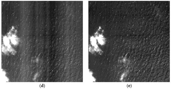 Corrected images of the high-brightness region of the side-slither data (the images were stretched for display): (a) raw data for the low-brightness region; (b) results obtained using polynomial fitting; (c) results obtained using laboratory coefficients; (d) results generated using on-orbit coefficients; (e) results generated using coefficients obtained by the proposed method.
